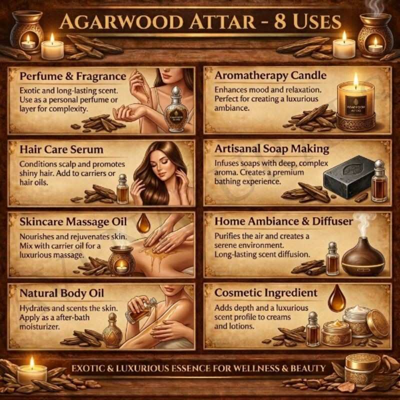 Candle makers value its strong and luxurious scent throw. Candles infused with Agarwood Attar produce an aura of refinement, perfect for creating calming or romantic atmospheres.