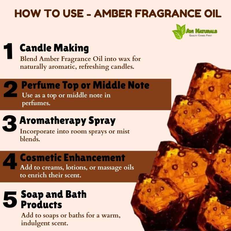 Combine with essential oils in massage or room sprays. Amber Fragrance Oil supports naturally aromatic, calming, and aesthetically rich environments.