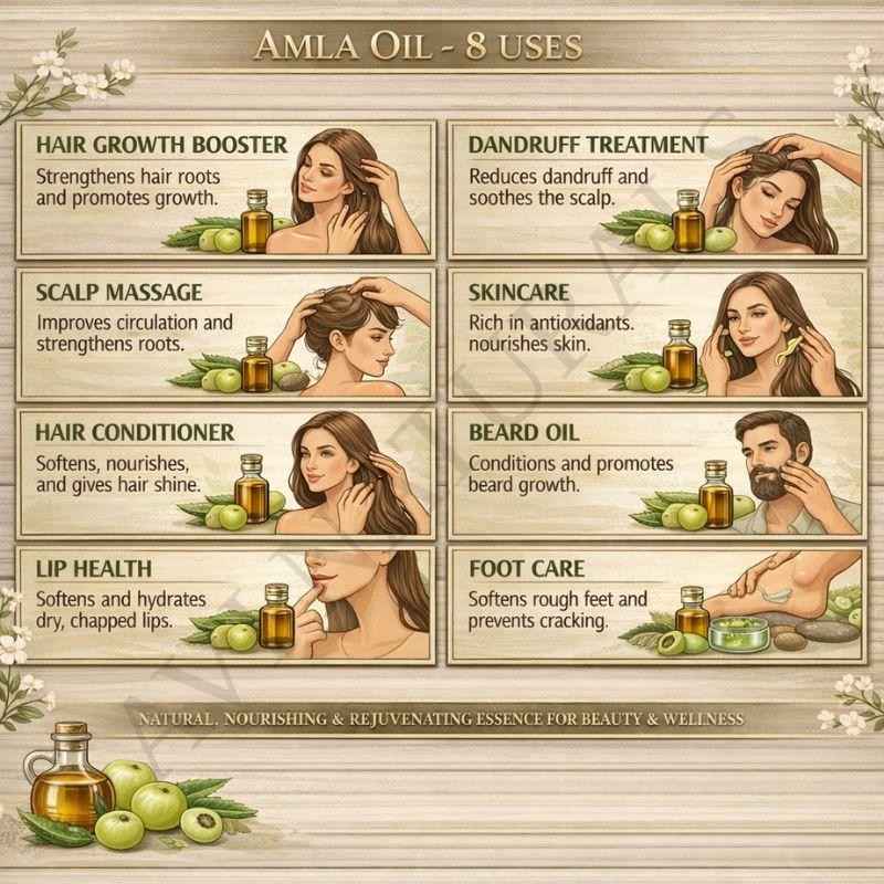 Answer: Amla Oil can be used in hair oils, hair masks, scalp oils, hair serums, and herbal hair blends.