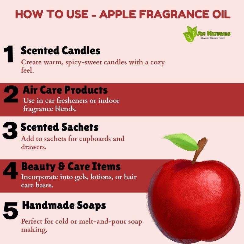 Use as a top note in perfumes. Apple Fragrance Oil blends with floral, citrus, or woody elements to produce naturally aromatic, refreshing, and sophisticated compositions.