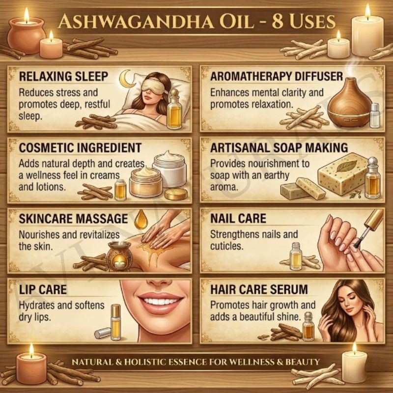 - Improved Sleep Quality: Ashwagandha is known to support the nervous system, which can contribute to improved sleep quality. Inhaling the aroma or applying it topically may aid in relaxation, promoting better sleep.