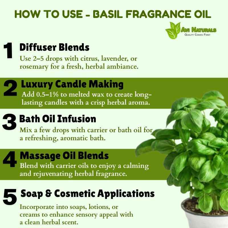 Use as a middle or top note in bespoke perfume formulations. Blend with citrus, floral, or woody notes and allow the mixture to mature for 24–48 hours. Basil Fragrance Oil adds freshness, clarity, and herbal elegance. - Bath Oil Infusion