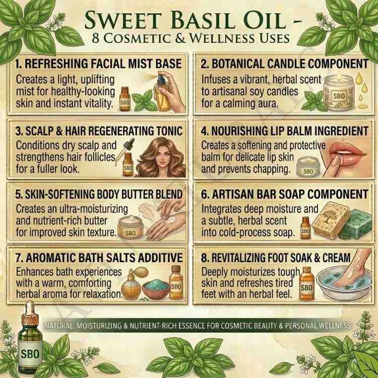 It functions as a potent top or middle note in perfumery. Basil Sweet Oil blends harmoniously with floral, citrus, or woody oils to create naturally aromatic, layered, and elegant compositions that remain stimulating, sophisticated, and memorable throughout use consistently.
