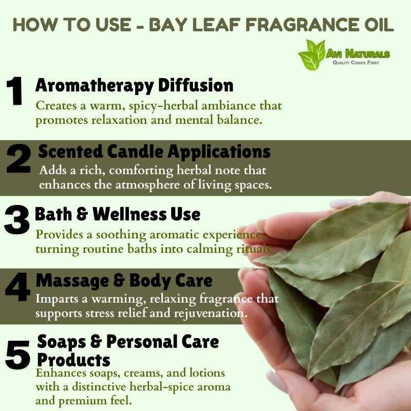 In perfumery, Bay Leaf Fragrance Oil can be layered with floral, woody, or citrus oils to create complex, sophisticated fragrances that stand out in personal collections.