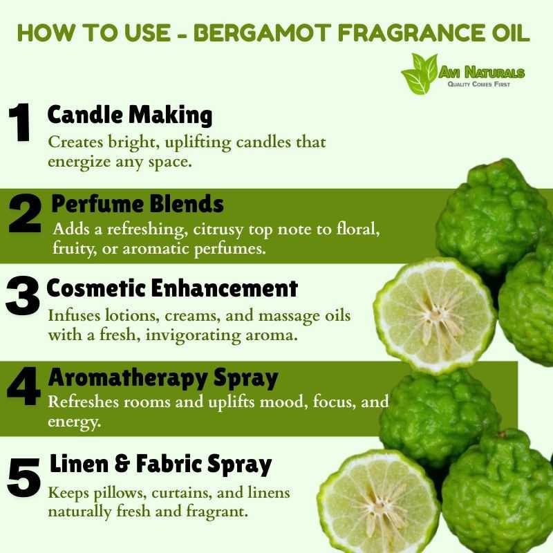 Mix a few drops with carrier oils or bath oils before adding to bathwater. Bergamot Fragrance Oil provides a luxurious, aromatic bathing experience, transforming ordinary baths into refreshing citrus rituals. - Aromatic Room Sprays