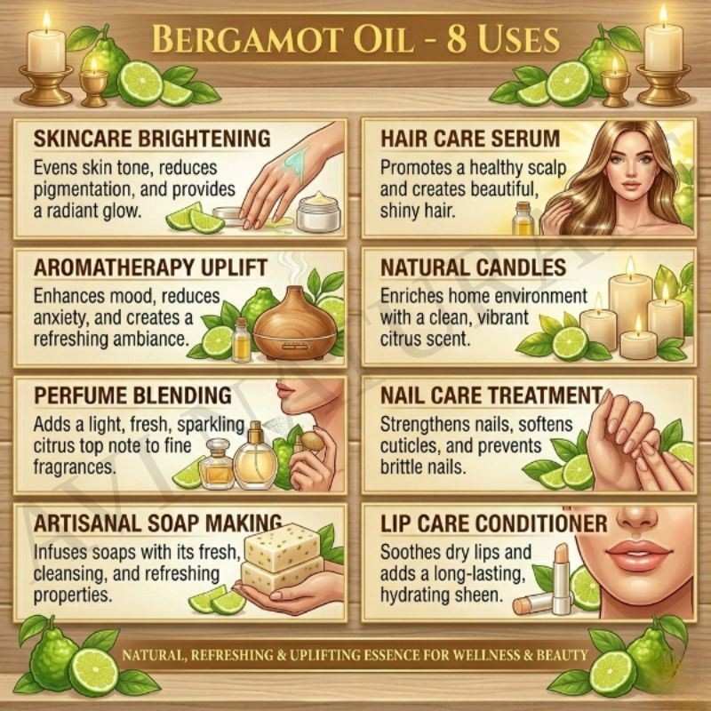Use as a potent top or middle note in perfumes. Bergamot Oil blends with floral, woody, or herbal oils, producing naturally aromatic, layered, and elegant fragrance compositions that remain luxurious, refreshing, and memorable throughout use.