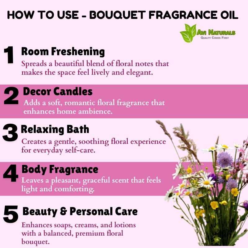Answer: It carries a soft, layered floral aroma inspired by a freshly arranged flower bouquet.Q2. Is Bouquet Fragrance Oil made from a single flower note?