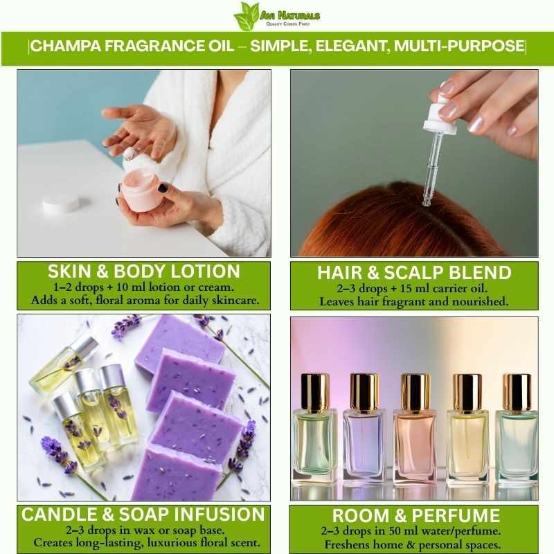 Mix a few drops with carrier oils or bath oils before adding to bathwater. Champa Fragrance Oil provides a luxurious, aromatic bathing experience, transforming ordinary baths into indulgent floral rituals. - Aromatic Room Sprays