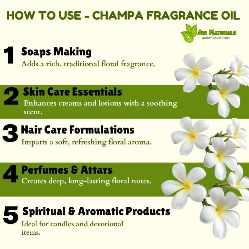 Champa Fragrance Oil maintains its rich floral scent over time, ensuring consistent fragrance performance in cosmetics, candles, and perfumery products. - Versatile Blending Capabilities