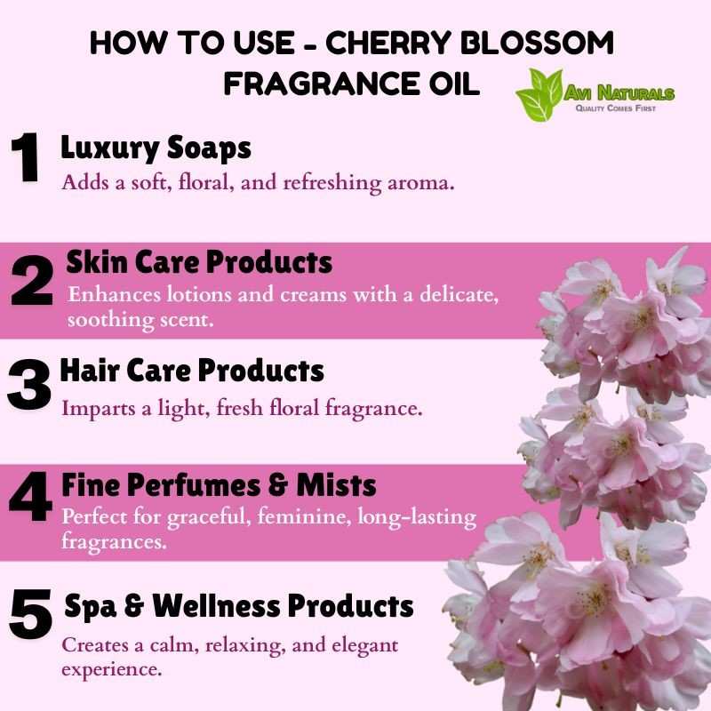 - Home Fragrance: Infuse your living spaces with the uplifting scent of cherry blossoms with Cherry Blossom Fragrance Oil. Use an essential oil diffuser to disperse the fragrance throughout your home, creating a tranquil and rejuvenating atmosphere. Whether used in the living room, bedroom, or bathroom, the delicate aroma of cherry blossoms will evoke feelings of serenity and renewal.