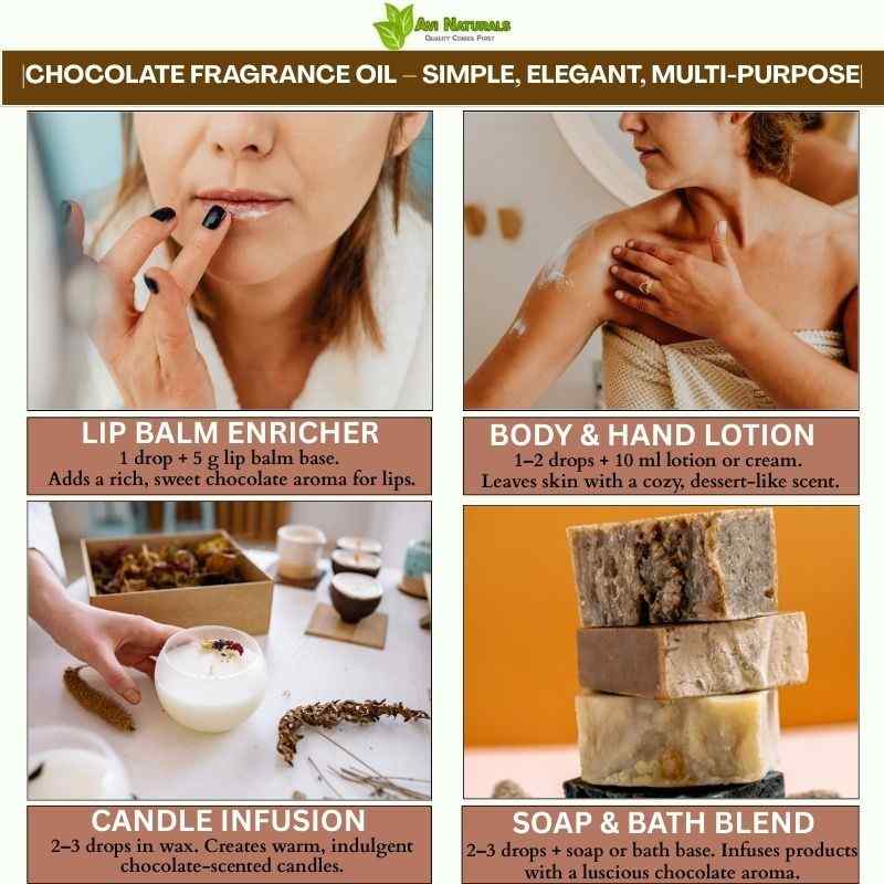 It functions as a versatile base or middle note in perfumery. Chocolate Fragrance Oil blends harmoniously with floral, woody, or gourmand scents to create naturally aromatic, layered compositions with luxurious depth.