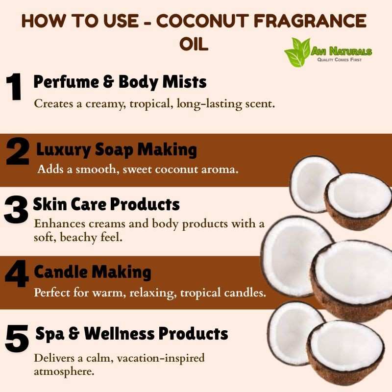 Use as a base or middle note in perfumes. Coconut Fragrance Oil blends with floral, fruity, or woody scents, producing naturally aromatic, layered, and tropical fragrance compositions.