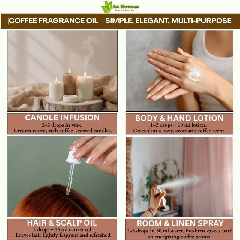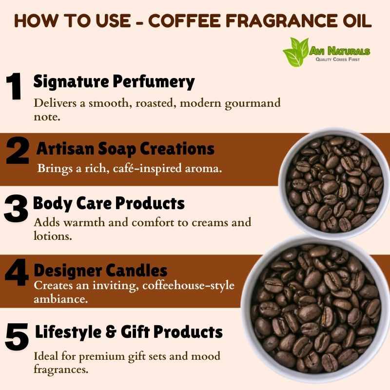 It functions as a versatile base or middle note in perfumery. Coffee Fragrance Oil blends harmoniously with floral, woody, or gourmand scents to create naturally aromatic, layered, and bold compositions.