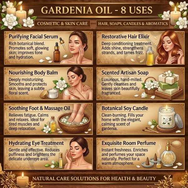 The rich, sweet aroma enriches tactile and aromatic experiences. Products infused with Gardenia Oil feel naturally aromatic, luxurious, indulgent, and floral, offering refined sensory appeal that enhances sophistication, elegance, and overall premium experience consistently.