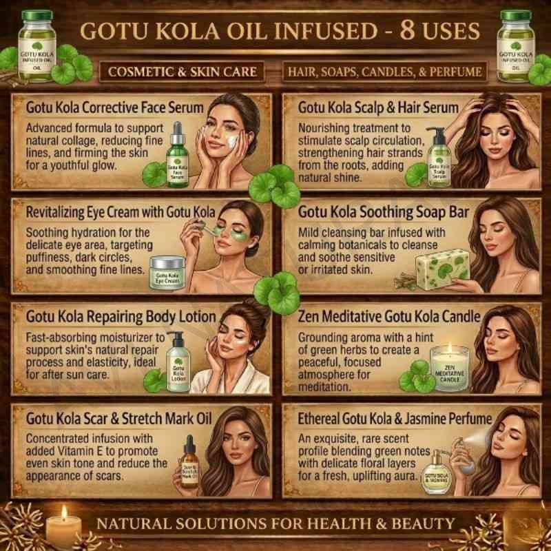 Perfumers and artisans use Gotu Kola Oil Infused to develop signature blends for candles, perfumes, and spa collections. Its green, fresh aroma inspires creativity, allowing for distinctive, elegant, and luxurious aromatic compositions. - Adds Depth and Uniqueness to Blends