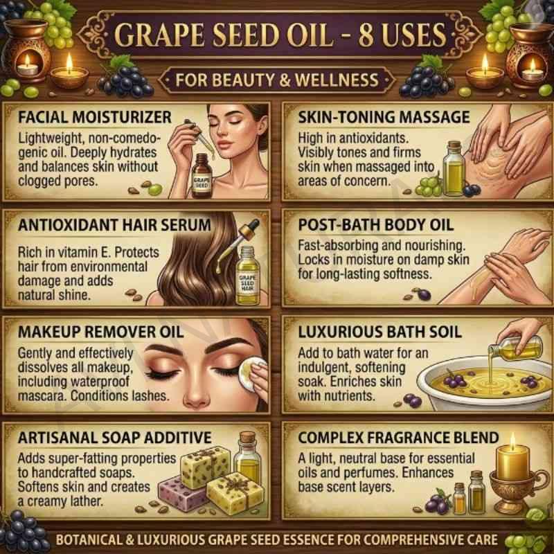 One of the most valuable benefits of Grapeseed Oil is its versatility in blending. It serves as an excellent carrier for essential oils, herbs, and other botanical ingredients. Whether creating face oils, body butters, balms, or perfumes, its neutral character allows the other ingredients to shine. Its consistency enhances absorption and application while ensuring product stability. Artisans and formulators appreciate how it enhances both function and feel, making it a key ingredient in natural skincare formulations.