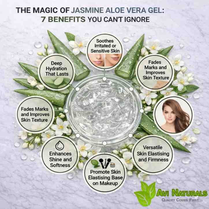Jasmine Aloe Vera Gel is a delicate fusion of botanical serenity and skin-reviving hydration. Carefully crafted using fragrant jasmine extracts and soothing aloe vera, this luxurious gel is a sensory delight that also pampers the skin with gentle nourishment. Its feather-light texture melts effortlessly, absorbing swiftly without any stickiness or residue. Designed for all skin types, it promotes softness, clarity, and freshness in every application. The natural floral essence uplifts the senses while the moisture-rich base nurtures balance and refinement. Ideal for integrating into everyday routines, this versatile gel serves multiple skincare needs—whether as a primer, light hydrator, or calmative layer post-exposure to harsh elements. Free from artificial enhancers, it embodies simplicity and purity, offering a clean alternative to heavily processed products. Jasmine Aloe Vera Gel is a fragrant journey into plant-based skincare that emphasizes elegance, ease, and effortless glow, helping you connect with nature while enhancing your skin’s natural grace.
