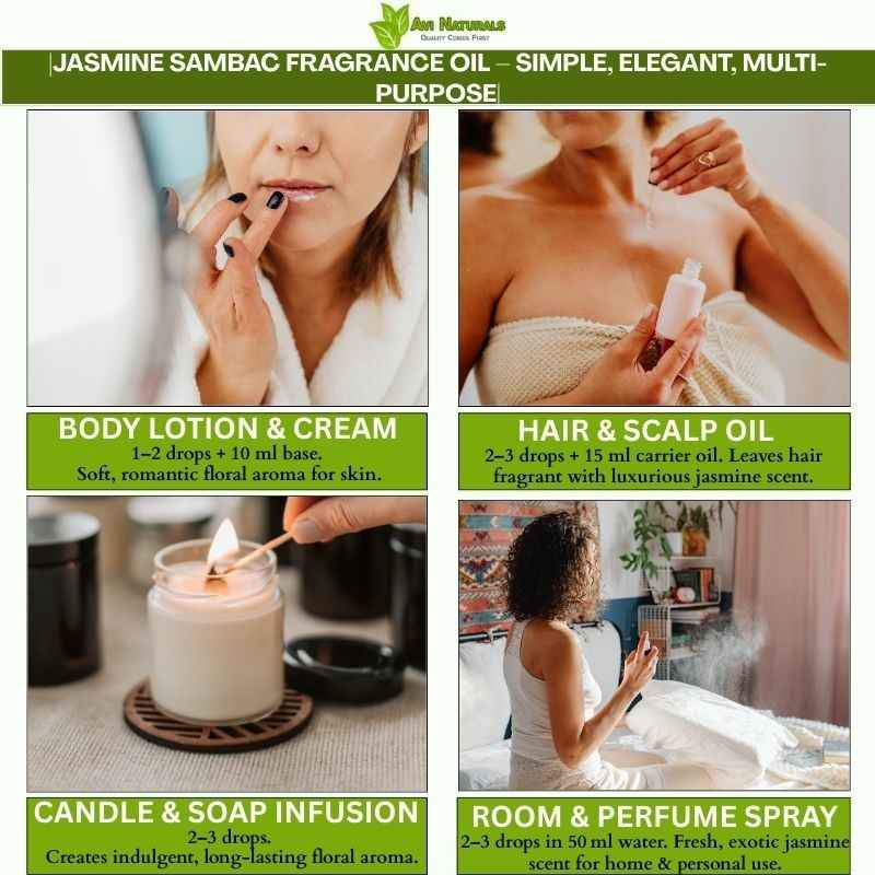 It functions as a versatile middle or top note in perfumery. Jasmine Sambac Fragrance Oil blends harmoniously with floral, woody, or oriental scents to create naturally aromatic, layered, and exotic compositions.