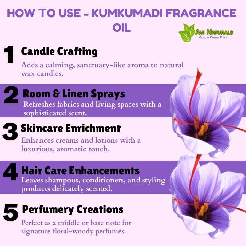 This fragrance oil is widely celebrated in the world of cosmetics, perfumery, and candle making, where it enhances products with a touch of timeless charm. In skincare formulations, it enriches the sensory experience with a subtle yet captivating aroma. In candles, it infuses spaces with a soothing ambiance, and in perfumes, it works as a versatile note for unique compositions. Kumkumadi Fragrance Oil redefines luxury through fragrance.