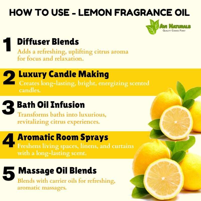 Mix a few drops with carrier oils or bath oils before adding to bathwater. Lemon Fragrance Oil provides a luxurious, aromatic bathing experience, transforming ordinary baths into revitalizing citrus rituals. - Aromatic Room Sprays