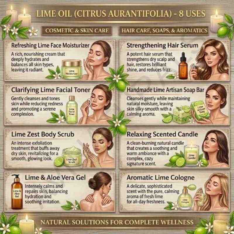 - Refreshing Lime Facial Toner: Formulate a refreshing lime facial toner by adding 3 drops of Lime Oil to 1/2 cup of witch hazel. Apply this blend to your face with a cotton pad after cleansing to tone the skin and promote a refreshed complexion.
