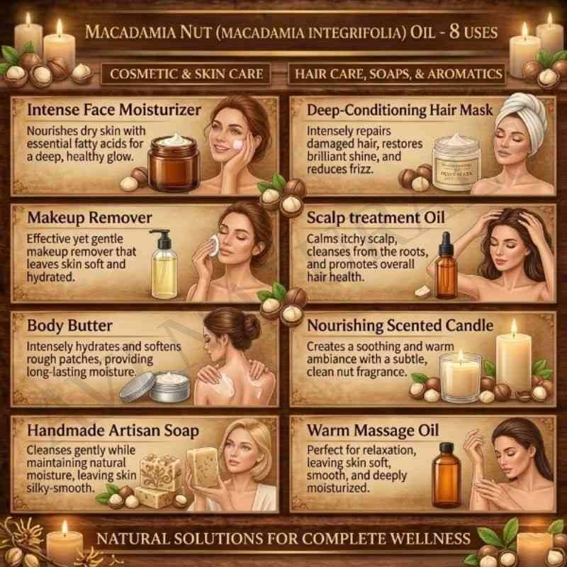 In perfumery, Macadamia Oil plays a subtle yet vital role. Its neutral yet rich base allows aromatic notes to shine while extending the longevity and smooth diffusion of fragrance compositions.