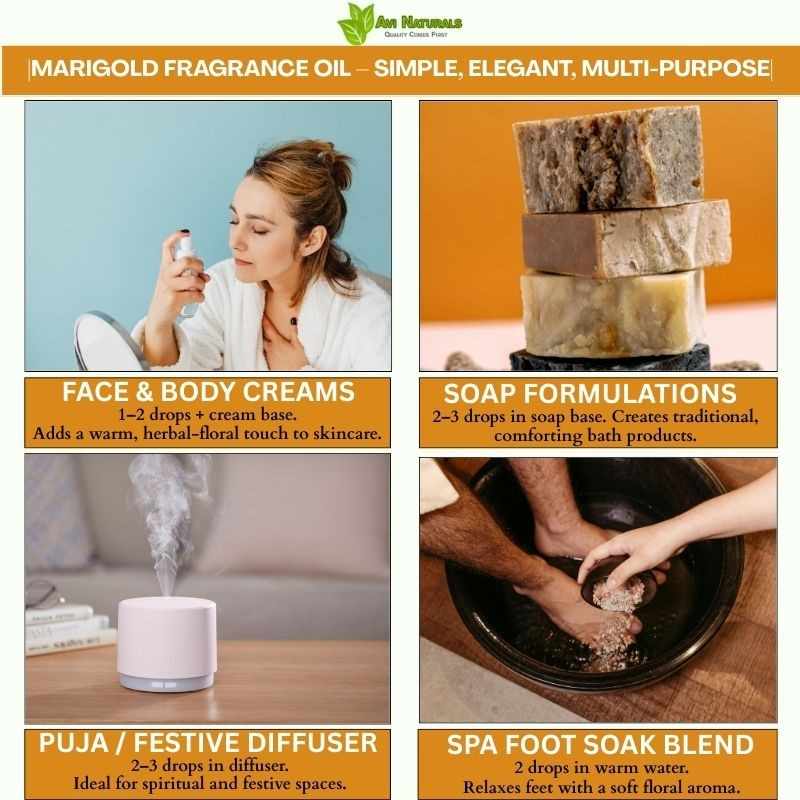 Its vibrant floral aroma enriches tactile and aromatic experiences. Products infused with Marigold Fragrance Oil feel naturally aromatic, luxurious, and refreshing.