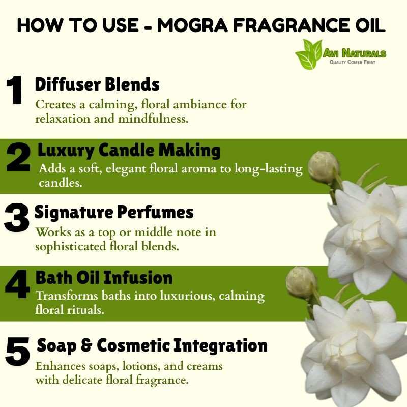 Use as a middle or top note in bespoke perfume formulations. Blend with woody, citrus, or light musky notes and allow the mixture to mature for 24–48 hours. Mogra Fragrance Oil adds elegance, floral sophistication, and freshness. - Bath Oil Infusion