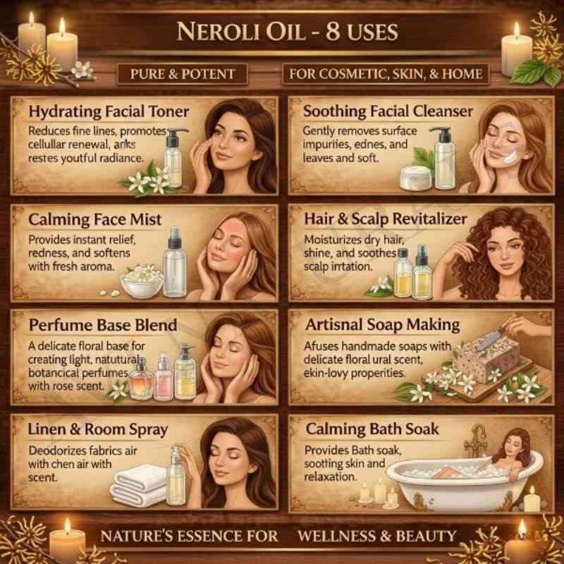 Neroli Essential Oil enriches creams, serums, and facial mists with its natural glow-enhancing qualities. It gives skincare blends a gentle fragrance while promoting smoothness and vitality.