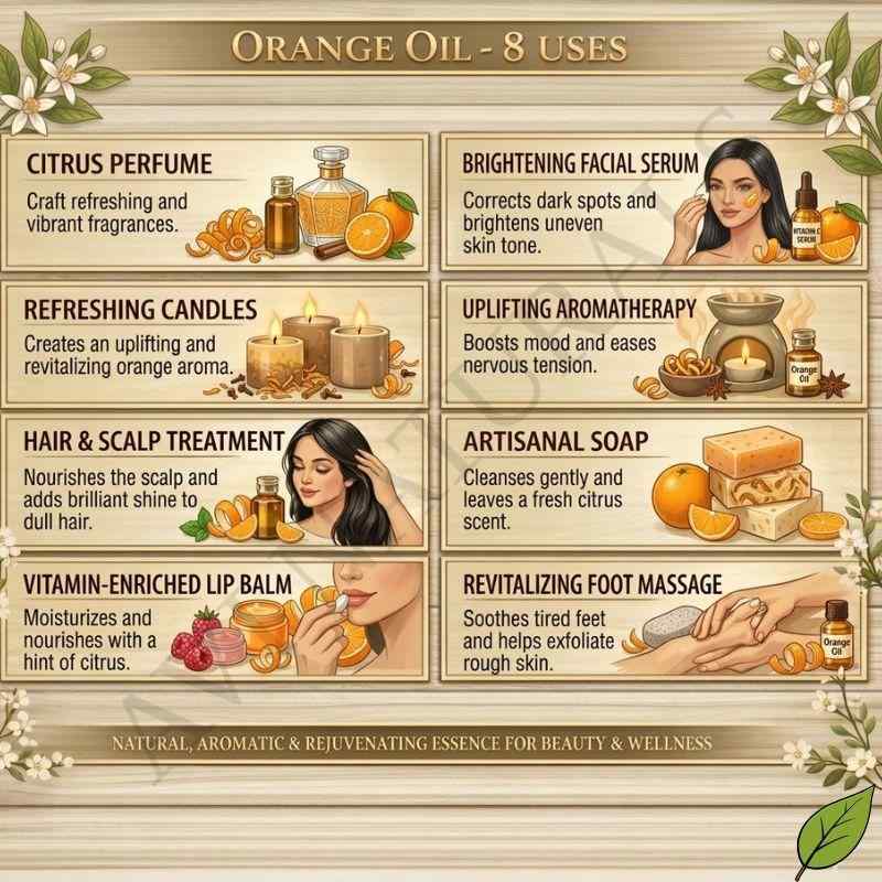 Orange oil is used in body sprays, hair care, and skincare products as a natural fragrance. Its gentle aroma offers a clean and elegant scent without overpowering the senses.