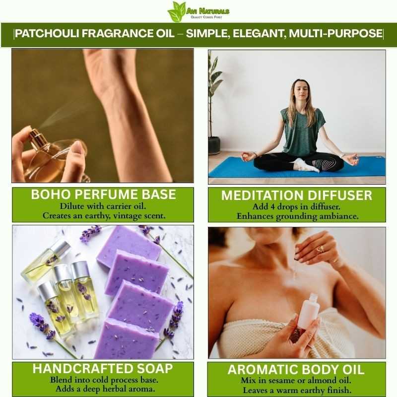 It functions as a versatile base or middle note in perfumery. Patchouli Fragrance Oil blends harmoniously with floral, woody, or oriental scents to create naturally aromatic, layered, and exotic compositions that remain elegant, distinctive, and memorable for extended wear consistently.