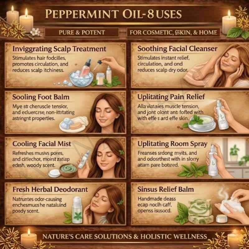 In personal care, Peppermint Oil plays a valuable role in hair rituals. It helps refresh the scalp by encouraging a clean and balanced surface, which is essential for a healthy appearance. A few drops added to a scalp oil or hair mask may enhance the feeling of cleanliness and clarity. The cooling sensation helps soothe areas of tightness or buildup while contributing to an overall sense of scalp vitality. Its invigorating aroma also adds a spa-like quality to regular grooming routines.