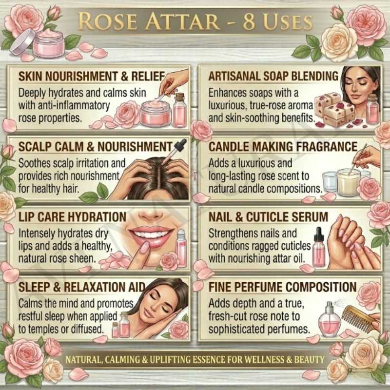 In hair mists or scalp sprays, Rose Attar delivers a subtle floral fragrance. It enriches sensory perception and leaves hair with a lingering floral aroma, enhancing personal grooming routines with sophistication and elegance.
