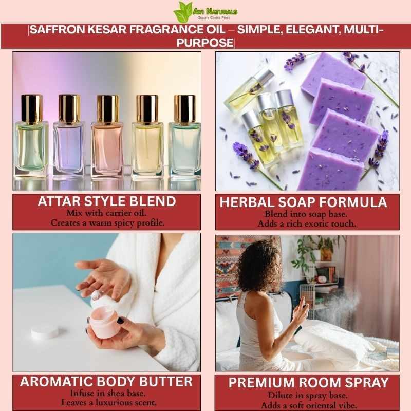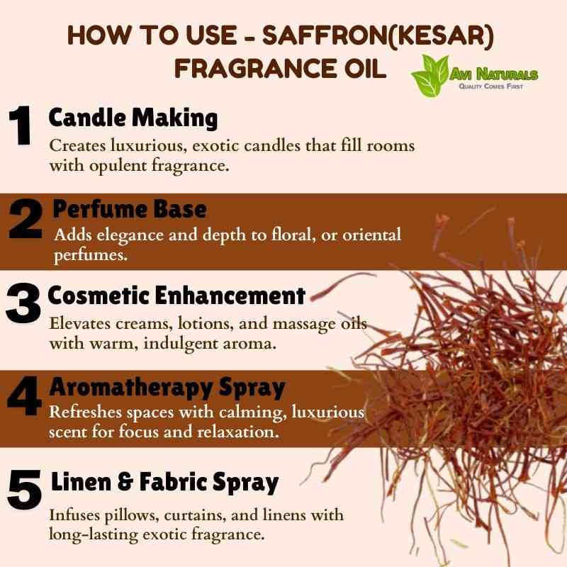Use as a base or middle note in perfumes. Saffron Kesar Fragrance Oil blends with floral, woody, or oriental scents, producing naturally aromatic, layered, and luxurious fragrance compositions that remain elegant, indulgent, and memorable throughout extended wear.