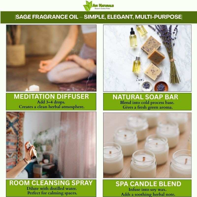 Incorporate Sage Fragrance Oil into body creams, butters, and lotions. Its herbal scent enriches the user’s experience, turning daily skincare into a luxurious aromatic ritual.