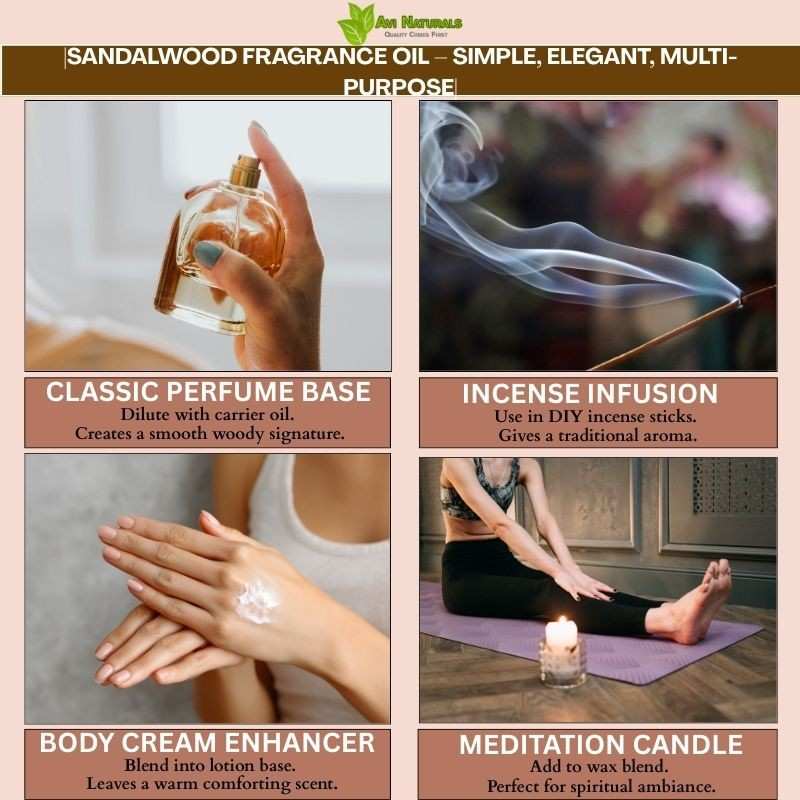 Combine with distilled water or hydrosols for indoor sprays. Sandalwood Fragrance Oil creates naturally aromatic, soothing, and inviting environments suitable for living, working, or meditation spaces, adding elegance, grounding, and luxurious ambiance effortlessly.