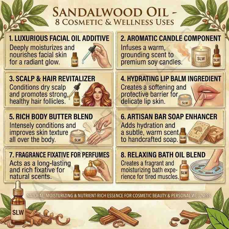 Sandalwood and Rose Moisturizer: Make a luxurious moisturizer by combining 1/4 cup of shea butter, 2 tablespoons of coconut oil, and 10 drops of this oil. Whip the ingredients together and apply this rich moisturizer to dry or mature skin.