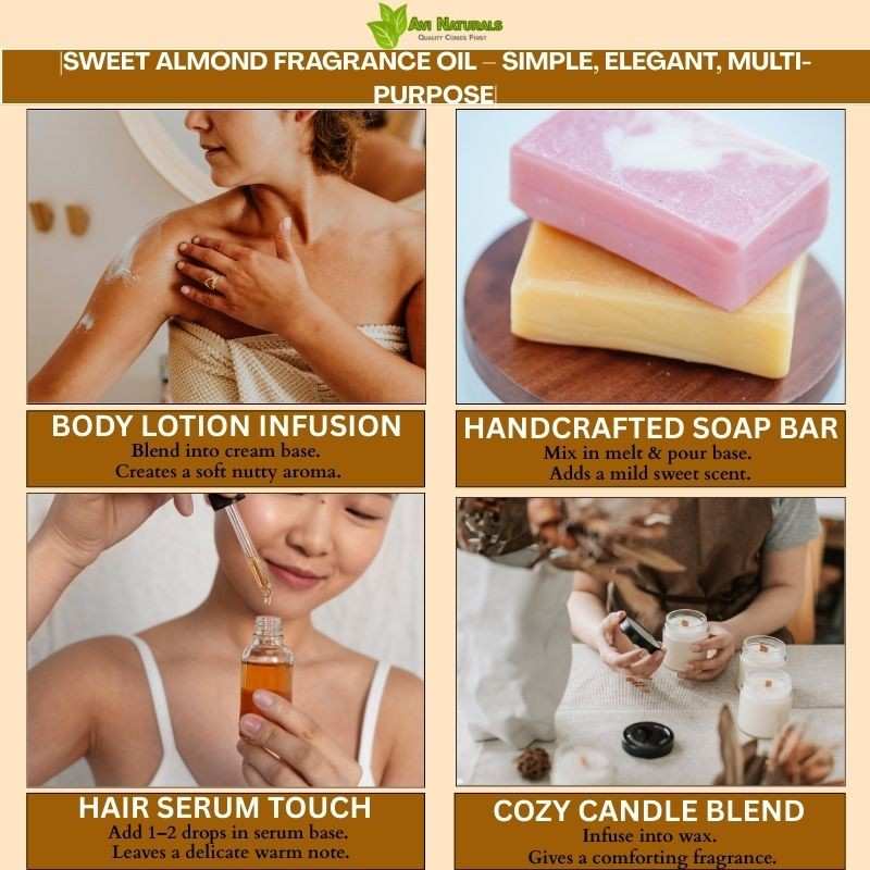 It is suitable across cosmetics, candles, and aromatherapy products. Sweet Almond Fragrance Oil’s naturally aromatic and versatile nature makes it essential for artisan creations seeking comforting, nutty, and soothing fragrance profiles that appeal to a wide range of users effectively.