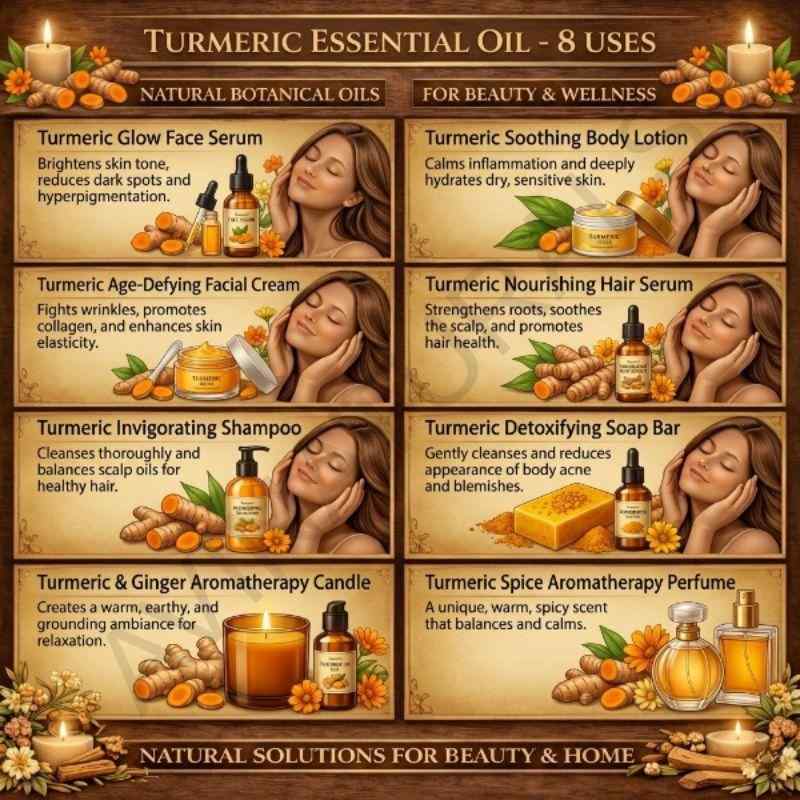 In spa therapies, Turmeric Root Oil is used in massages, body wraps, and steam treatments to create deeply indulgent experiences. Its aroma enriches rituals, making them feel more holistic and luxurious.