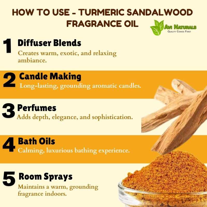 Mix a few drops with carrier oils or bath oils before adding to bathwater. Turmeric Sandalwood Fragrance Oil provides a luxurious, aromatic bathing experience, transforming ordinary baths into calming, exotic rituals. - Aromatic Room Sprays