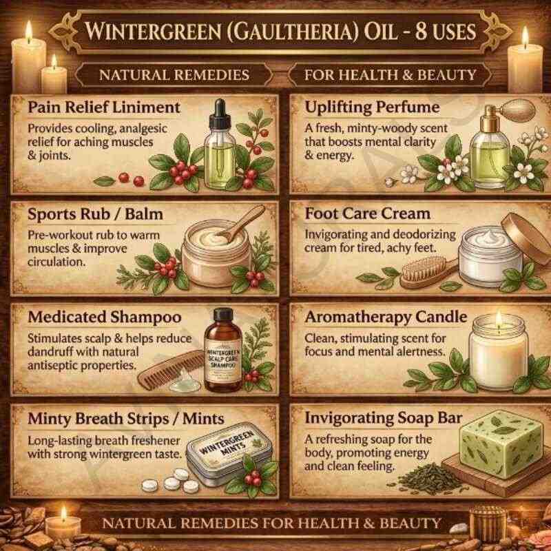 - Natural Pain Reliever: It is renowned for its natural pain-relieving properties. It contains methyl salicylate, a compound with analgesic and anti-inflammatory effects. When diluted with a carrier oil, It can be applied topically to provide relief from muscle aches, joint pain, and headaches.