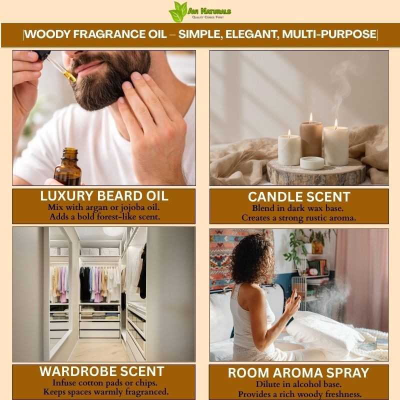 Woody Fragrance Oil can be infused into bath bombs or salts to transform baths into spa-like escapes. Its aroma helps cultivate an atmosphere of calmness and inner peace.